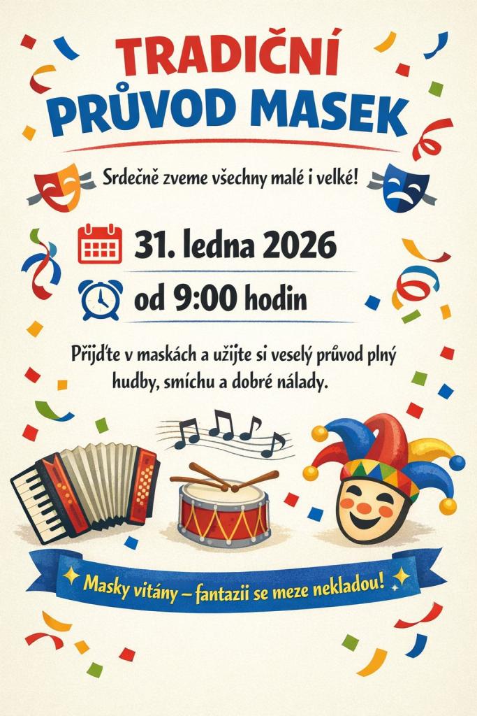 Všichni velcí i malí jsou zváni na tradiční průvod po vsi v maskách. Těšíme se, co vymyslíte za masky.